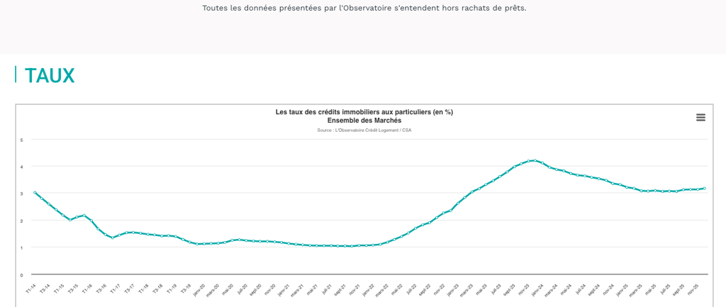 En septembre 2025 le vent a tourné. Entre juin et décembre, les taux sont remontés de 11 points de base, passant de 3,06% à 3,17%. Ce mouvement s'est poursuivi en janvier 2026 : à mi-mois, le taux moyen atteignait déjà 3,21% selon Michel Mouillart, l'économiste en charge de l'Observatoire.